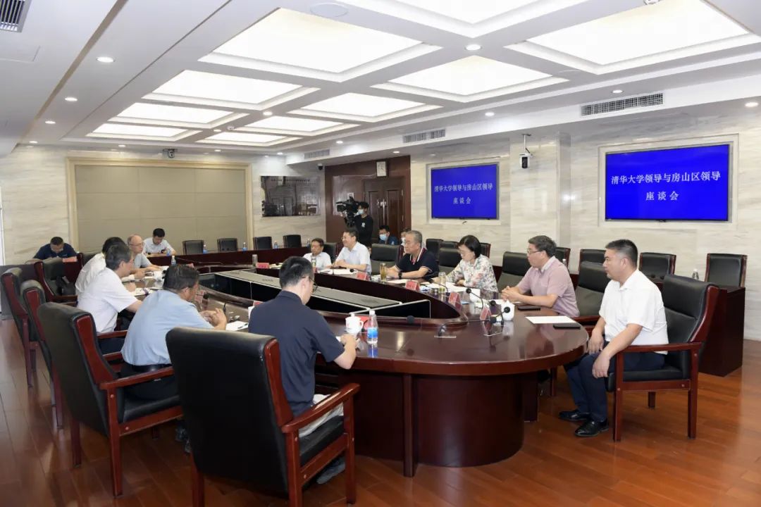 考察结束,清华大学与我区召开座谈会。会上,双方就校地合作建设九年一贯制学校和附属高中相关情况进行交流发言。