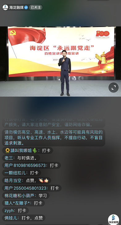 永远跟党走,逐梦新时代。今年是中国共产党成立100周年,为推动党史学习教育持续深入开展,展示海淀区广大党员干部群众在大力发扬红色传统、传承红色基因的良好风貌,8月31日上午,海淀区举办了一场别开生面的“永远跟党走”百姓宣讲网络宣讲活动。来自海淀区科技、教育、卫生等领域的5位优秀宣讲员走进直播间,与网友们讲述他们爱党爱国、在平凡岗位做出不平凡业绩的感人事迹。