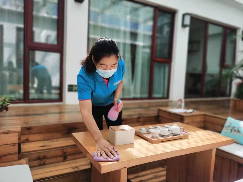 记者来到村里的一家的民宿内,看到工作人员正在对公共区域进行日常消毒,并在消毒登记表上登记。