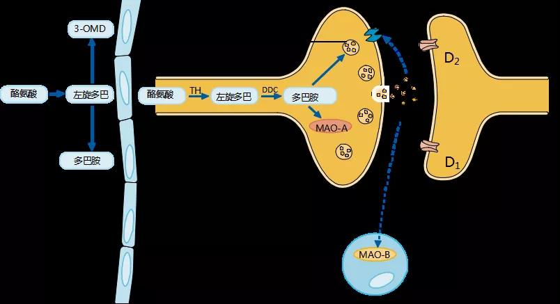 1990年左右,儿茶酚胺-O-甲基转移酶(catechol-O-methyl transferase, COMT)抑制剂、单胺氧化酶(monoamine oxidase, MAO)B抑制剂相继问世。