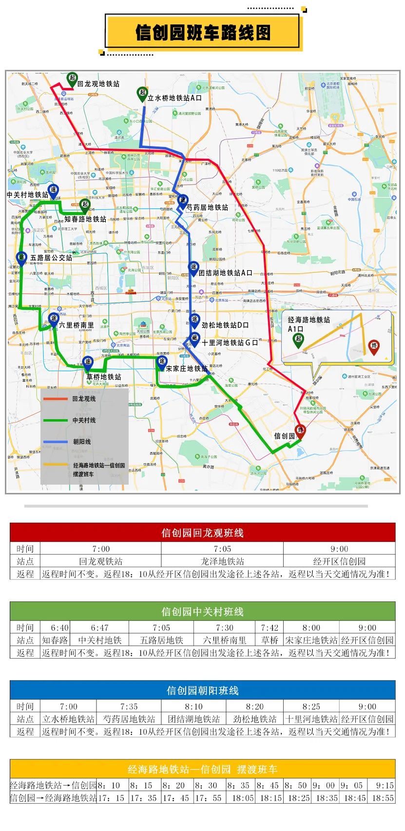 @园区小伙伴们,北京经开区信创园又出新福利啦!为了更好服务入园企业,满足员工上下班通勤需求,北京经开区信创园在已开通的中关村班线、回龙观班线2条通勤班线的基础上,又增加了朝阳班线!下周一(9月6日)正式开通运营啦~