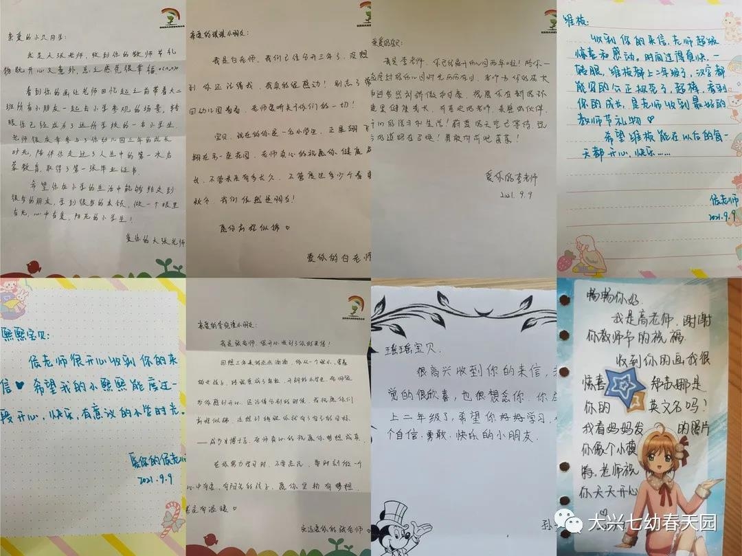 教师是一份爱的职业,幼儿园教师更是需要十足的耐心和爱心,收到已经毕业的学生来信,不仅蕴含了学生对教师的感恩之情,更加大大鼓励了教师工作的热情和面对工作压力的信心,同时也是幼儿园情感教育成果的体现,尊师重道是中华民族的传统美德,是对中华文化的传承。在大兴七幼还有很多同样优秀的教师,他们在默默耕耘、默默奉献,在此祝福所有的教师教师节快乐,工作顺利!