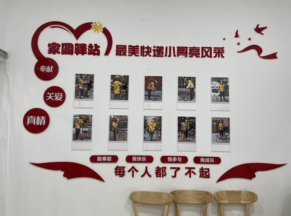 在华联家圆驿站走廊里,记者发现,这里还设有一面“最美快递小哥亮风采”的展示墙,展示了“小哥”们在社区中最美的样子——有清扫社区垃圾的,有擦拭垃圾桶,还有摆放共享单车……此外,驿站外还建立了一个可同时为16辆电动车电池充电的充电柜。