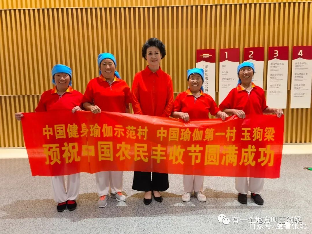 著名喜剧表演艺术家黄晓娟在节目彩排间隙与玉狗梁的瑜伽老人合影留念