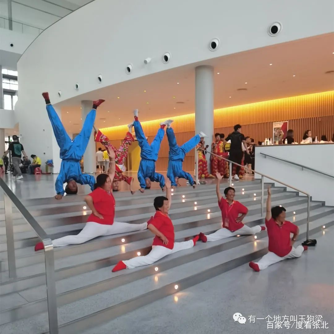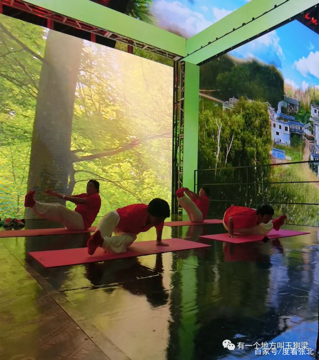 这是录制现场的画面,整个节目分为了6个表演区域,场面宏大,玉狗梁瑜伽队和汕头武术队在表演区的二层展示(左上)。