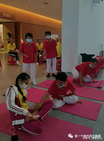 参加舞蹈表演的小姑娘被玉狗梁瑜伽奶奶的表演惊到了,忍不住的走到瑜伽垫前向瑜伽奶奶请教学习双盘。