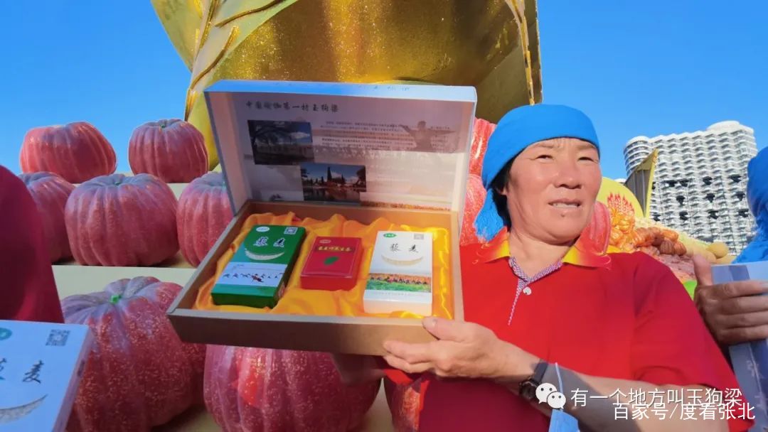 瑜伽老人在丰收成果展台上展示自己的“玉狗梁”牌藜麦农产品。