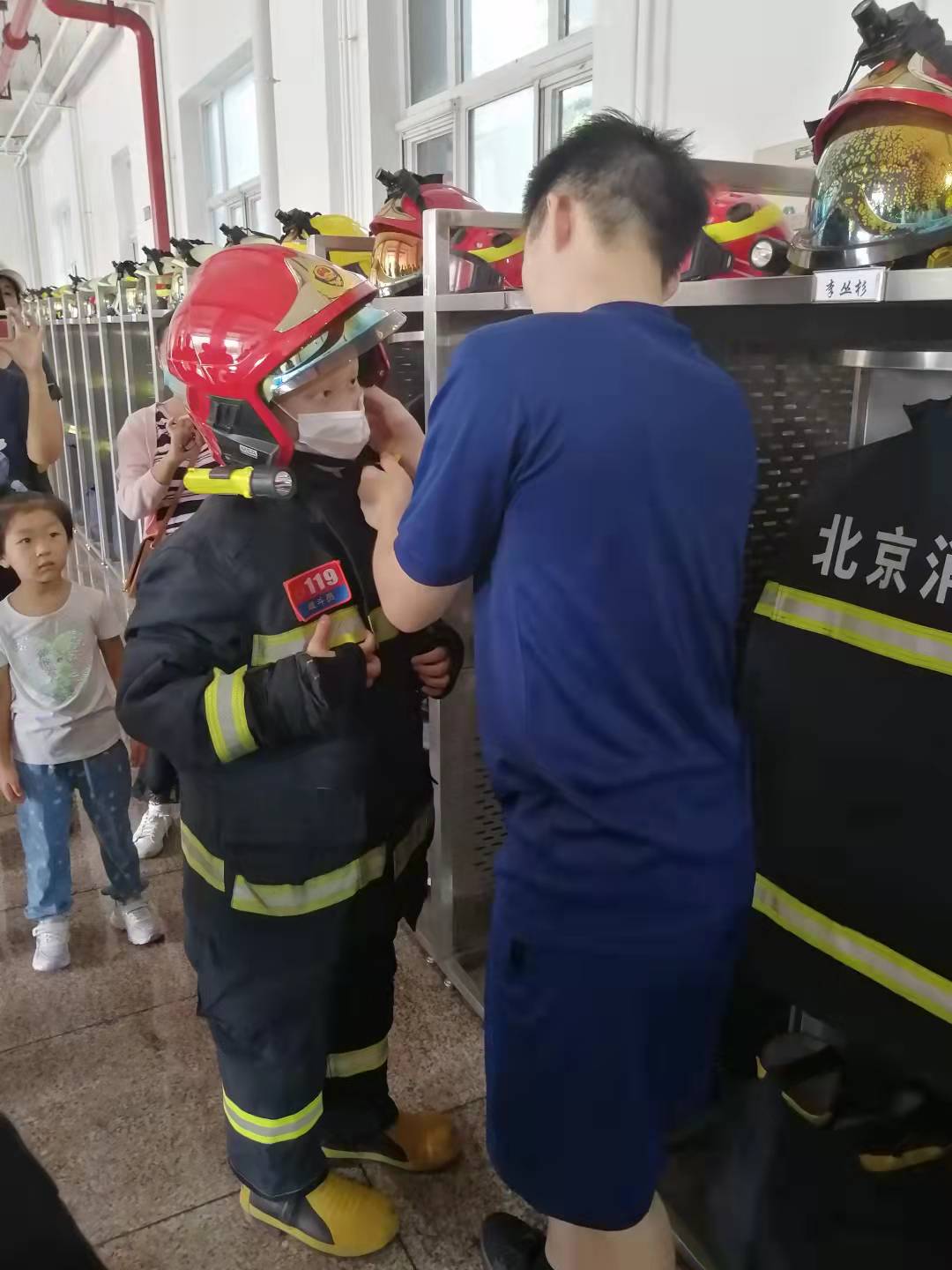 指导员还结合生活实际,详细讲解了在发生火灾时如何报警、如何扑救、如何逃生自救等消防安全常识。同时,在指导员手把手的帮助下,小朋友们还与部分消防器材来了个“亲密接触”,穿上“战斗服”,面对面体验消防魅力,开心学习消防知识。