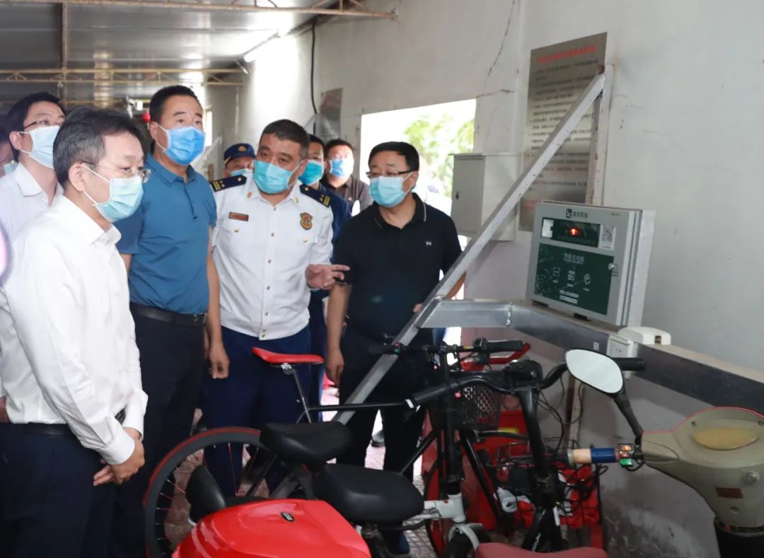 在双兴小区,龚宗元先后深入居民楼和小区公共电动车车棚,详细了解了电梯内电动自行车智能阻车系统运行原理和效果,查看了公共电动车车棚内自助式电动车充电桩使用情况,以及消防安全工作落实情况。