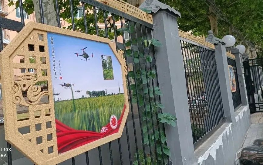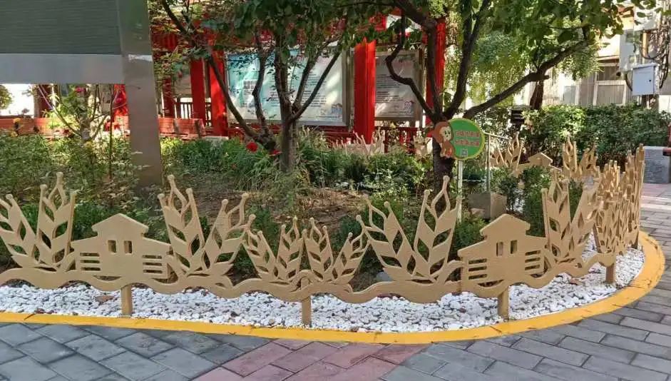 社区铁艺围栏和花坛围栏都装饰有以麦穗为主要元素的图案和相关文化主题的宣传画,花坛围栏也以麦子图案的铁艺装饰,正在建设的回廊、设计精巧的文化树坑……让这个社区文化主题和文化气质显现得越来越丰满。