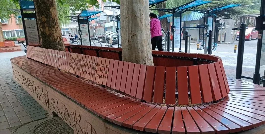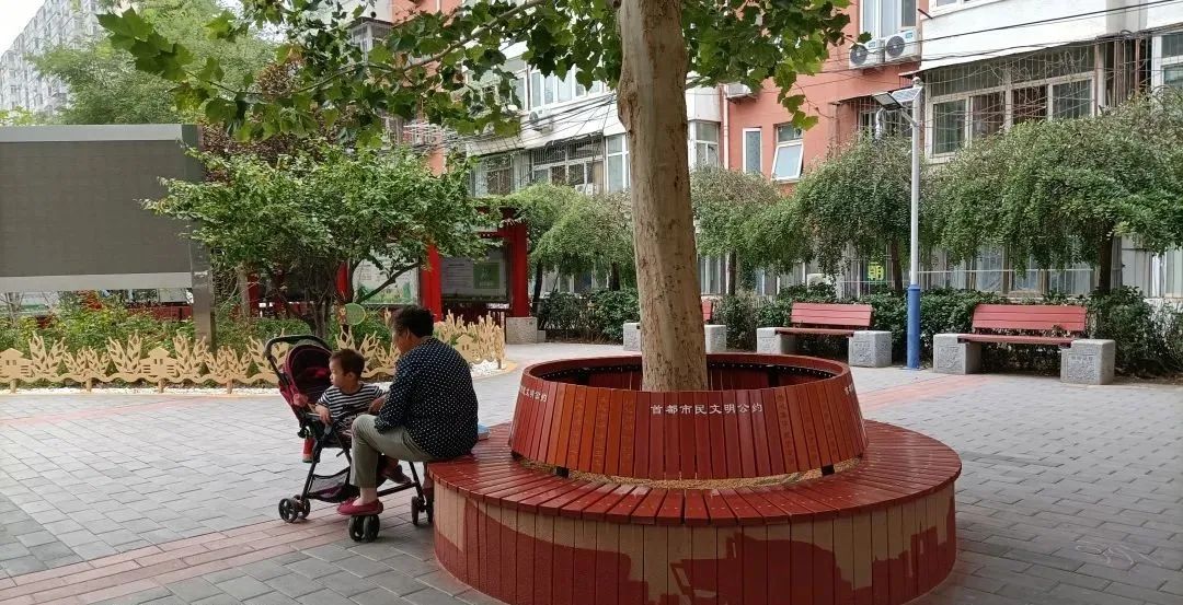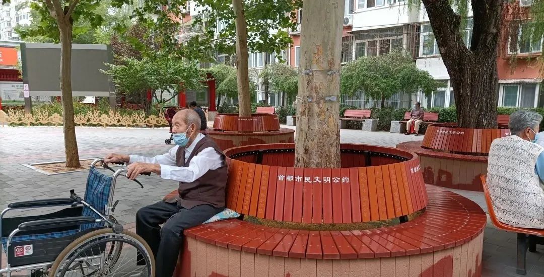 立体改造:撤掉原本的糟木板,换上聚酯木座椅,让居民在广场遛弯儿时有个歇脚的地方。在改造中还添加了文化元素。如椅背上印首都市民文明公约,座椅下是三环地标剪影墙。