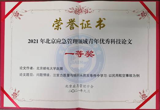 近日,由北京应急管理学会主办的北京应急管理领域青年优秀科技论文评选活动在京举行。共有来自13个单位11所高校的34篇论文参与评选。经过初步筛选、专家评选和现场答辩等多个环节,我校经济管理学院赵晨副教授最终荣获一等奖。