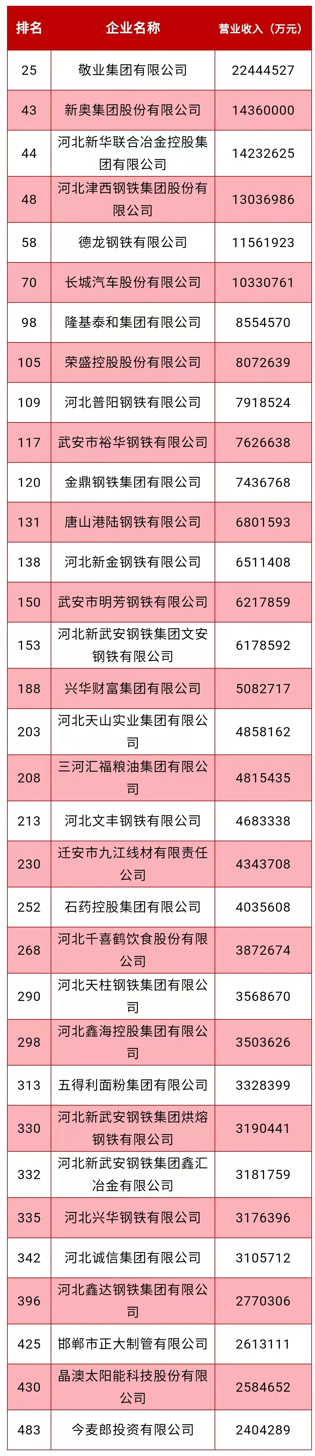 9月25日,2021中国民营企业500强峰会上发布了2021中国民营企业500强榜单,河北省有33家企业上榜,入围企业数量位居全国第5。其中敬业集团有限公司、新奥集团股份有限公司、河北新华联合冶金控股集团有限公司,分别位列榜单第25、43、44位。
