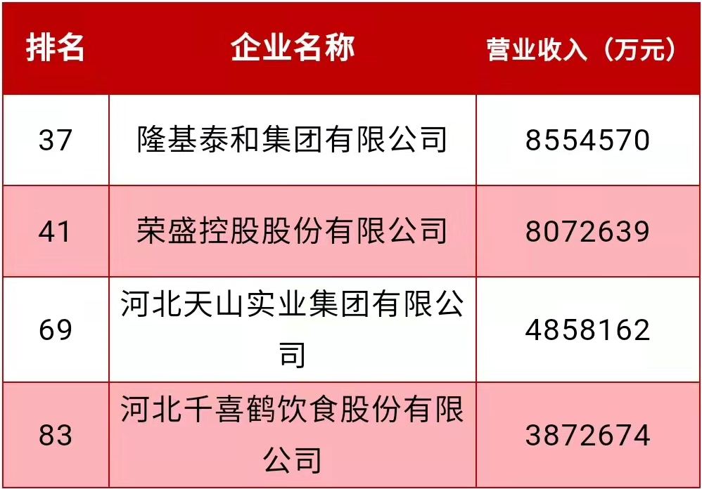 此外,河北省38家企业上榜2021中国民营企业制造业500强榜单,隆基泰和集团有限公司等4家企业上榜2021中国民营企业服务业100强榜单。