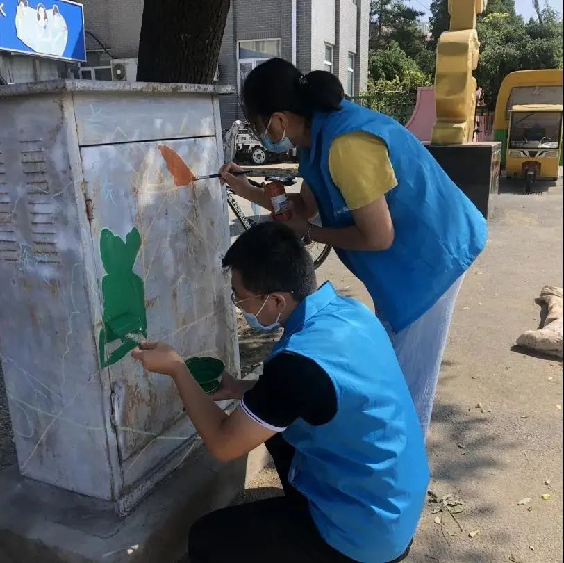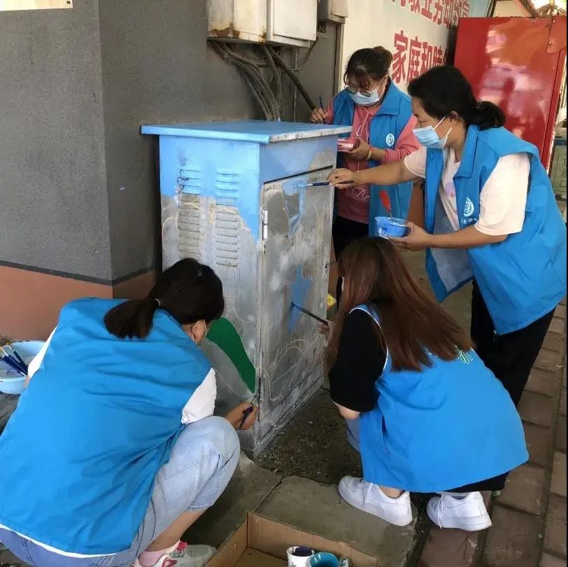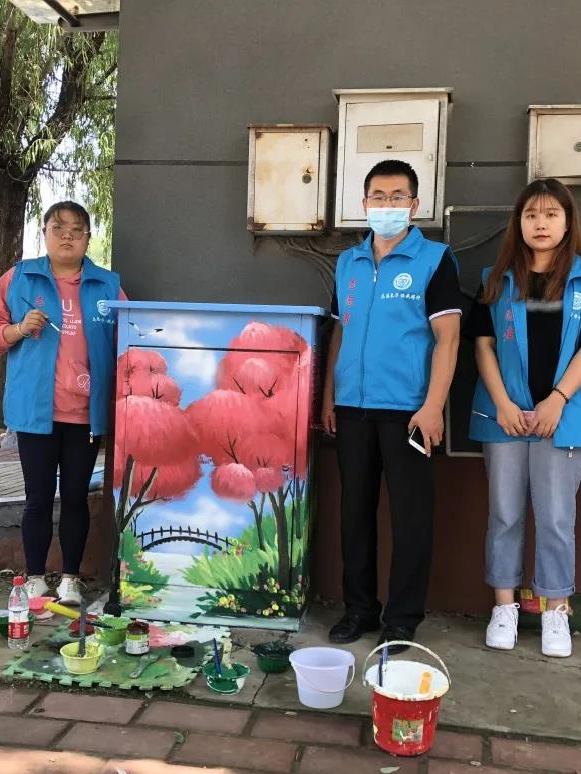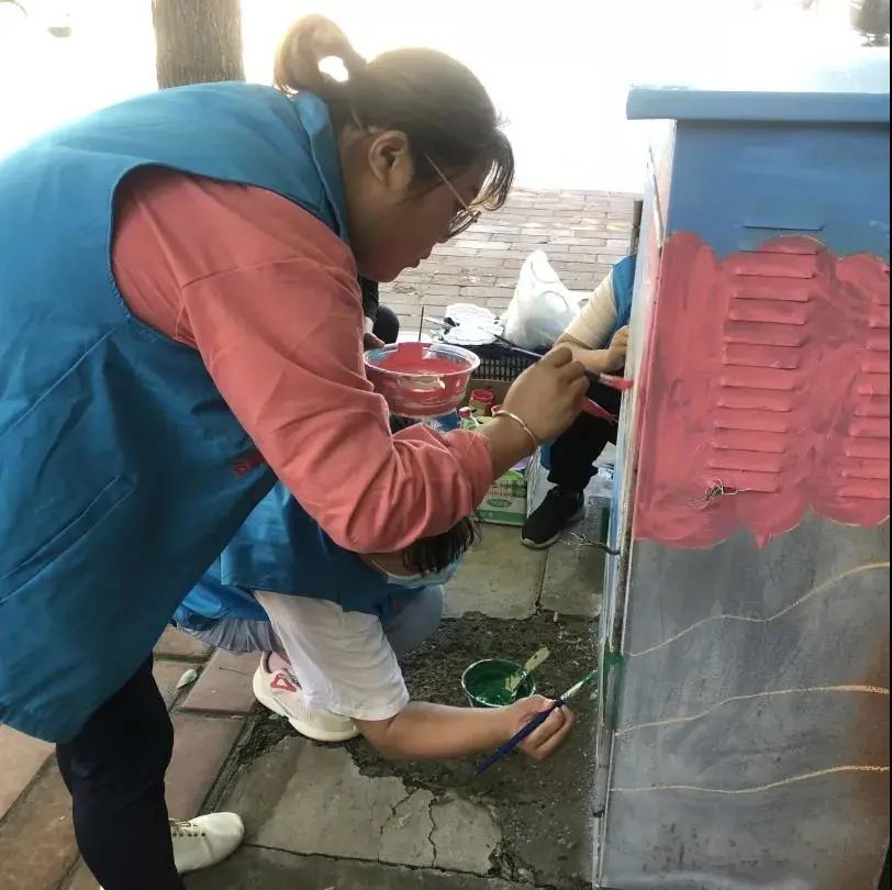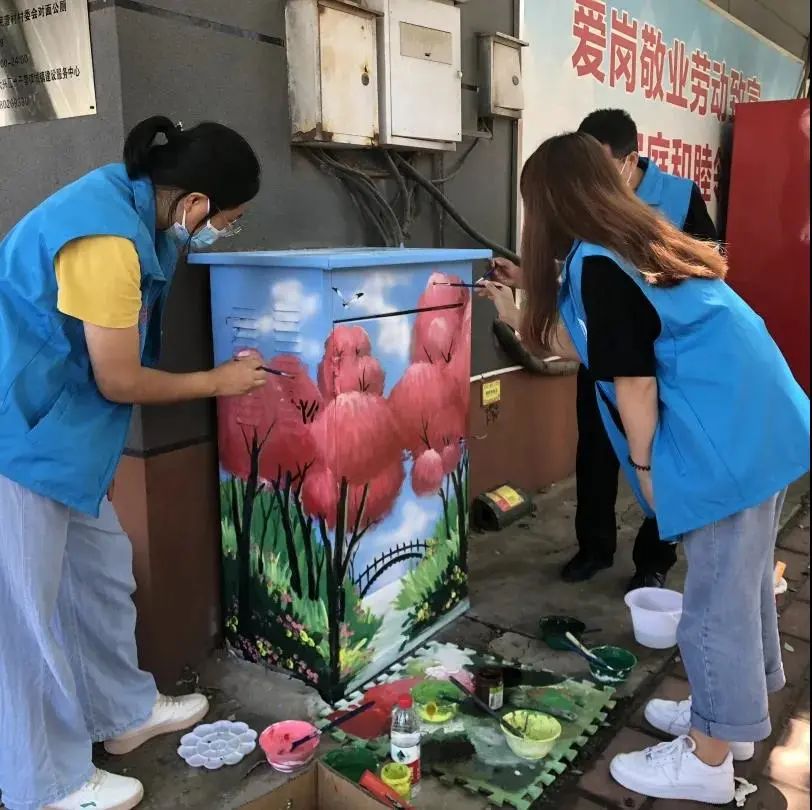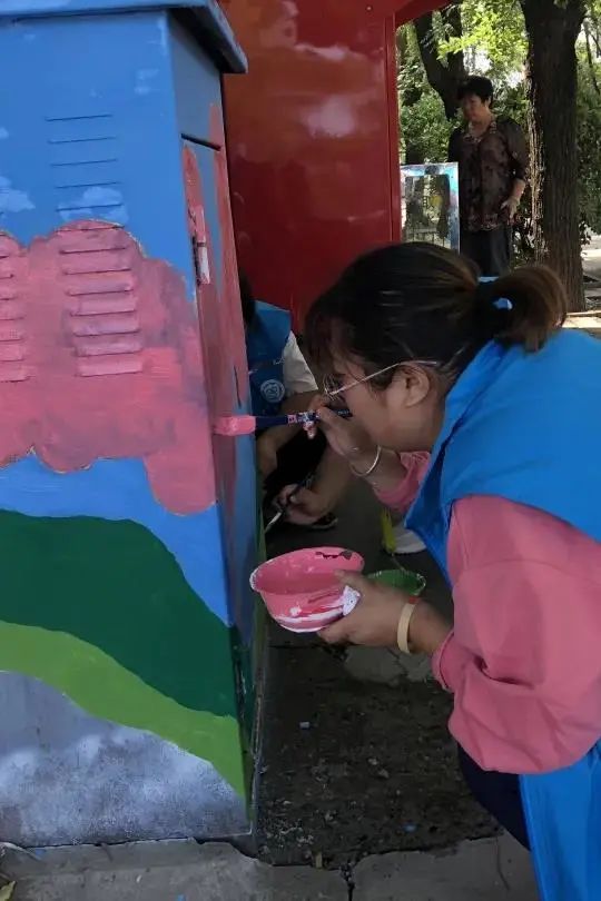 为了达成最好的效果,志愿者们在老师的带领下,认真清理电表箱的表面,让电表箱不再“灰头土脸”;接着由老师勾画出图画的轮廓,志愿者们为电表箱填涂上色。从暗淡无趣的“铁疙瘩”到活泼美观的“创城微景观”,一个个电表箱的华丽变身背后凝聚整个志愿者团队的奇思妙想和身体力行。