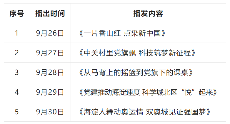 从9月26日—9月30日在海淀有线电视《海淀新闻》栏目后播出,每日一集。