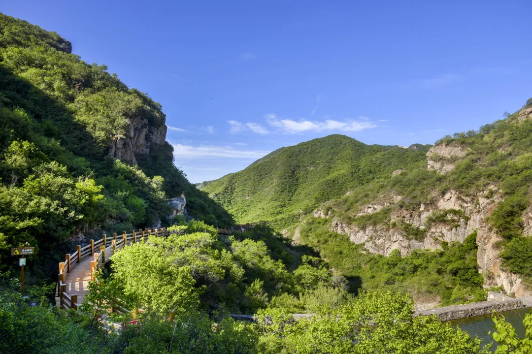 村北的长峪城木栈道沿耸立的石山和水库顺势而建,沿着登山栈道前行,一路秋色,更是令人陶醉。