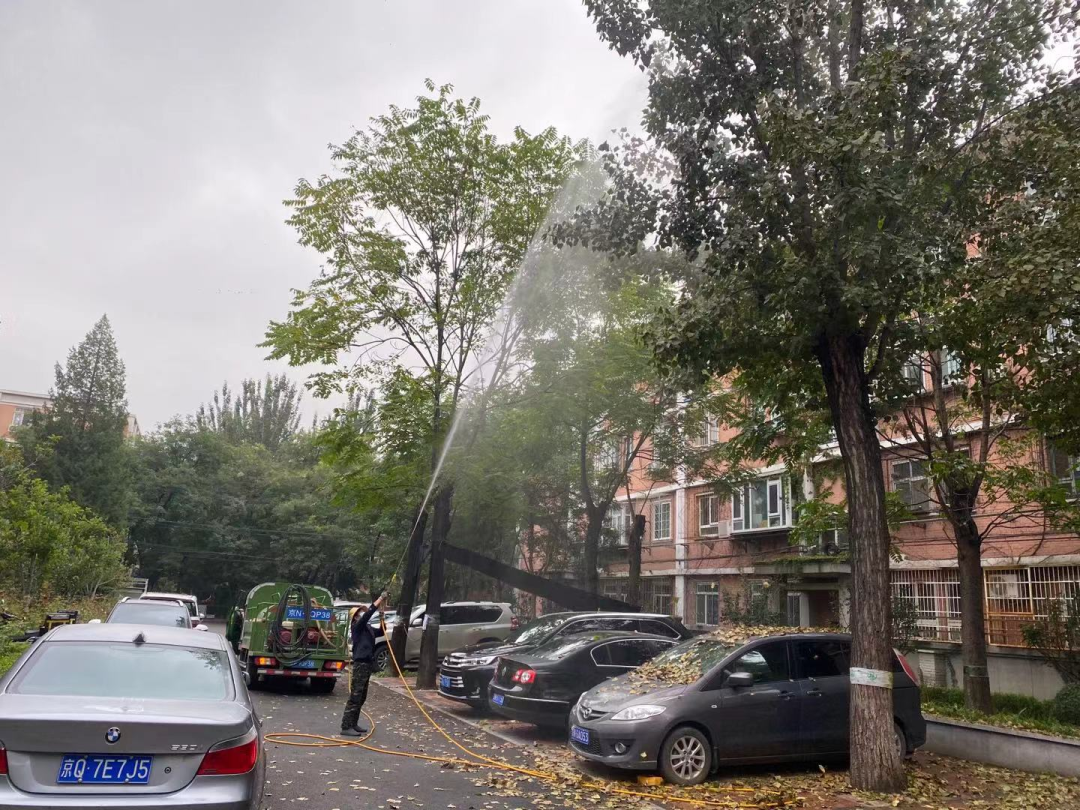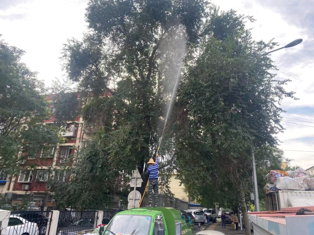 街道动员绿化队、各社区物业单位,联防联办,对各自管辖区域树木进行药物喷洒消杀。由于美国白蛾幼虫常在较高的树木上觅食,街道绿化队细化工作流程,采用大功率的高压喷药水枪向高点喷药消杀,力争做到不留一处死角,不漏一棵树木,确保药防作业全覆盖。经过消杀,大量白蛾幼虫从树上掉落下来。当药雾散去、地面变得干燥后,街道立即组织保洁人员对掉落在地面上、车顶处的幼虫进行清理。