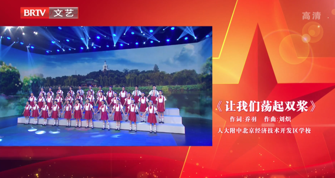 在歌声里追寻闪耀的红星,在旋律里感受信仰的力量。七月假期,人大附中经开学校金童爱乐合唱团受北京电视台邀请,45位合唱团团员走出校园,迈上舞台,代表北京经开区参加由北京市教委组织的“歌声里的红星”歌咏活动汇演录制。9月30日,录制的两首合唱歌曲在北京卫视文艺频道播出,人大附中经开学校合唱团的孩子们再次精彩亮相北京卫视,用红色的歌声表达爱党爱国之情。