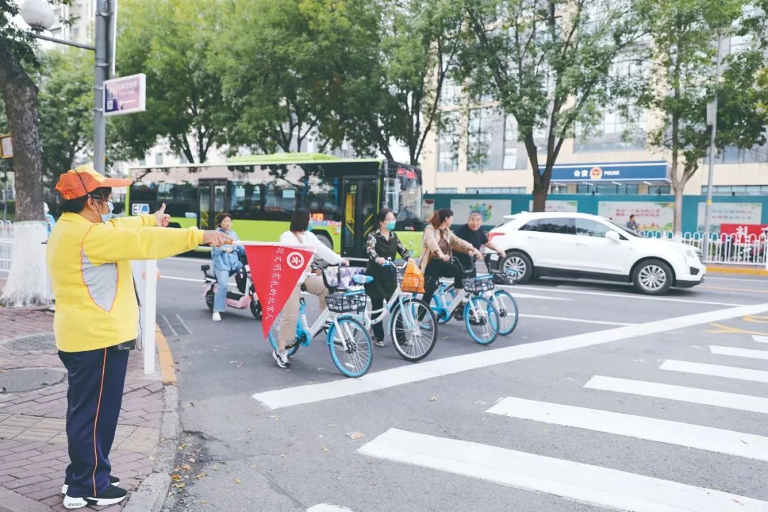 文明引导员在顺平辅线与拥军路交叉口引导市民文明驾车、礼让斑马线。