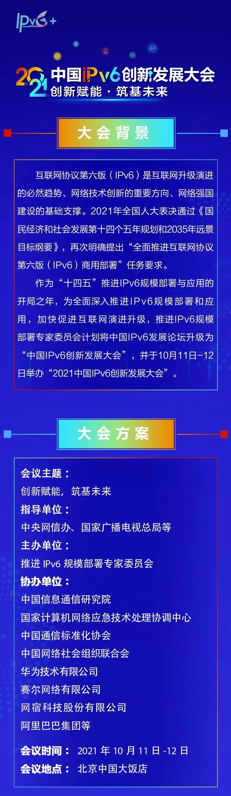 作为“十四五”推进IPv6规模部署与应用的开局之年,为全面深入推进IPv6规模部署和应用,加快促进互联网演进升级,由中央网信办、工信部、国家广电总局等指导,推进IPv6规模部署专家委员会主办的“2021中国IPv6创新发展大会”,于2021年10月11-12日在北京重磅开幕。