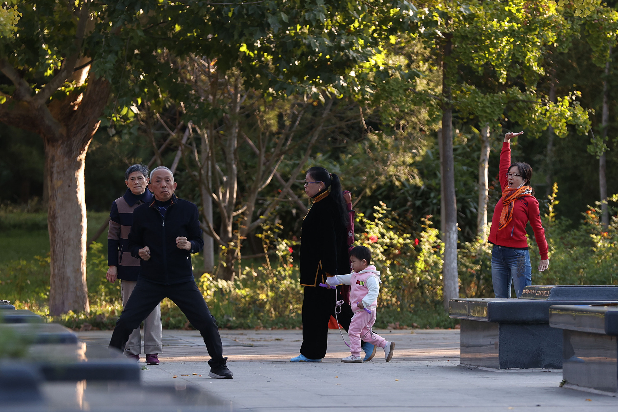 市民在博大公园漫步、健身