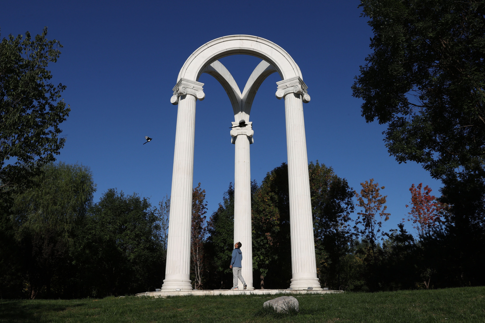 在博大公园,晨练的市民抬头观赏飞翔的喜鹊