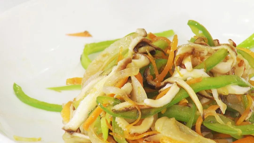 步骤1: 洋葱,香菇,柿子椒,胡萝卜切丝,下锅炒熟;加入食盐,生抽调味,装盘备用。