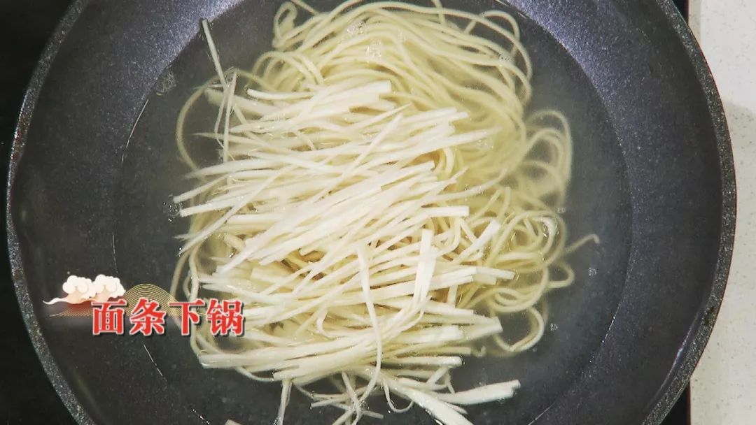 步骤2: 手擀面,杏鲍菇丝下锅煮熟,捞出过凉水备用。