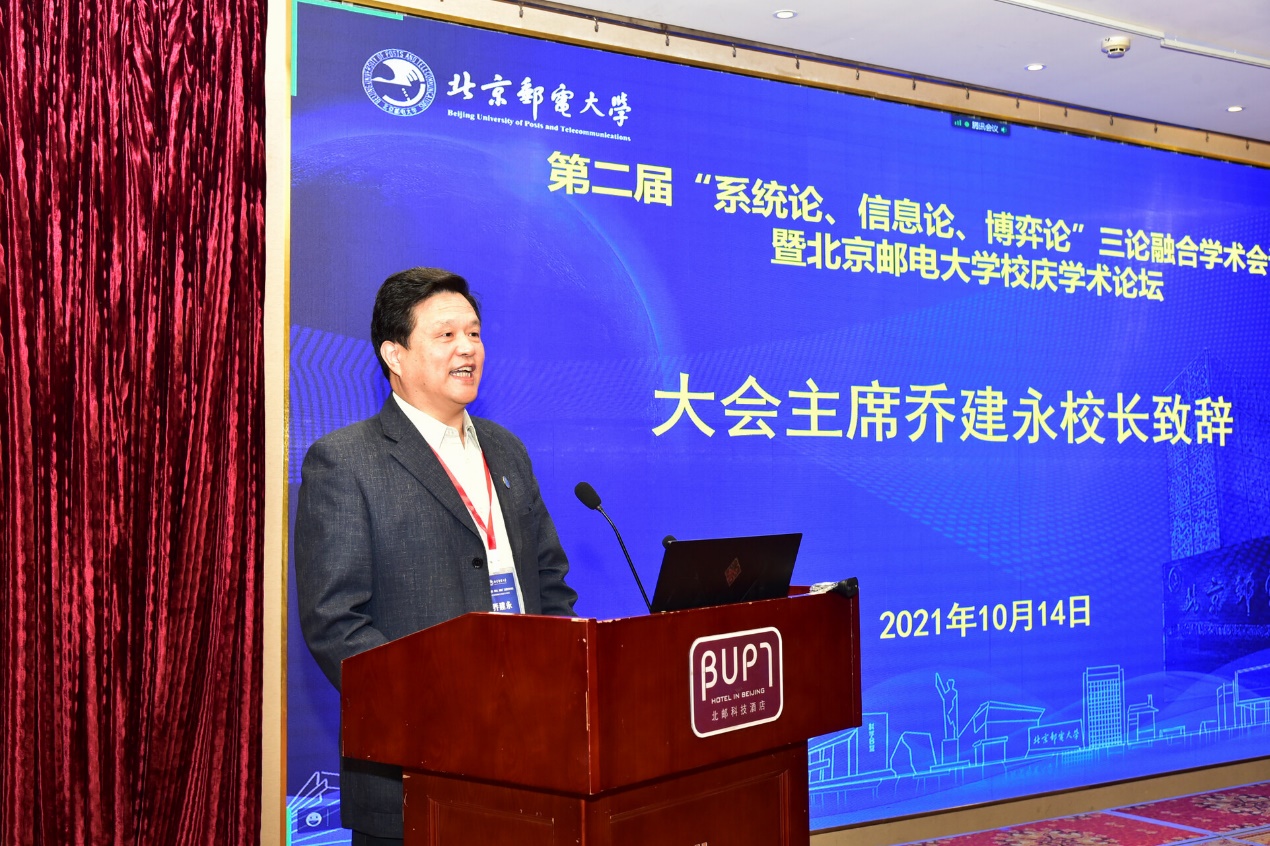 乔建永指出,本次三论融合学术会议的核心问题是如何充分发挥“系统论”的整体分析长处、结合“信息论”的技术指导基础、兼采“博弈论”的实践解释优势。乔建永表示,希望此次会议能够为实现“万物智联、数字孪生”的美好愿景贡献力量,带动北京邮电大学更多的师生投身于三论融合交叉研究,推动北京邮电大学学术研究不断向前发展。