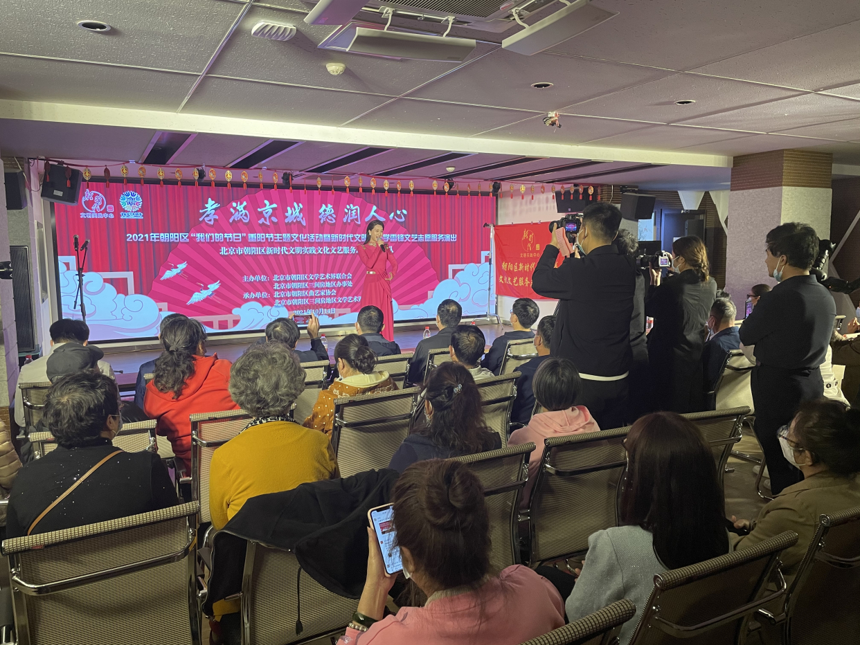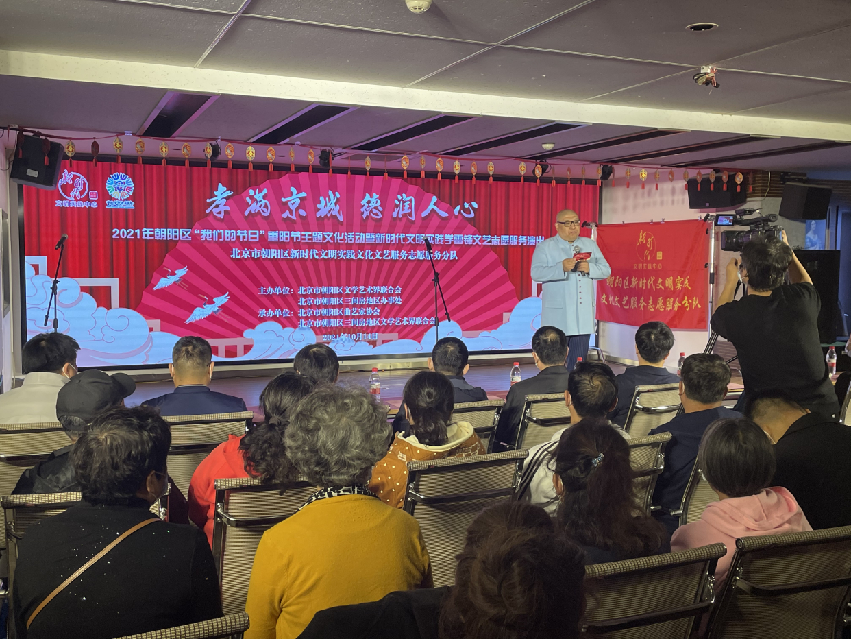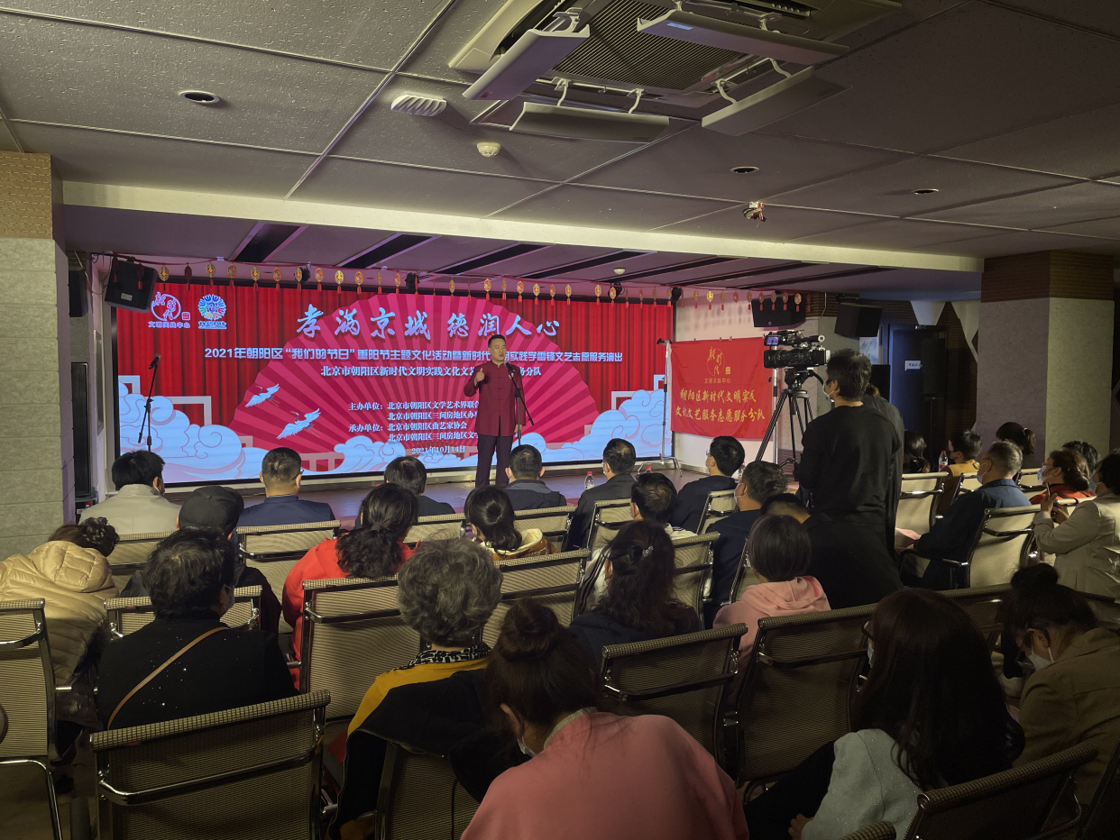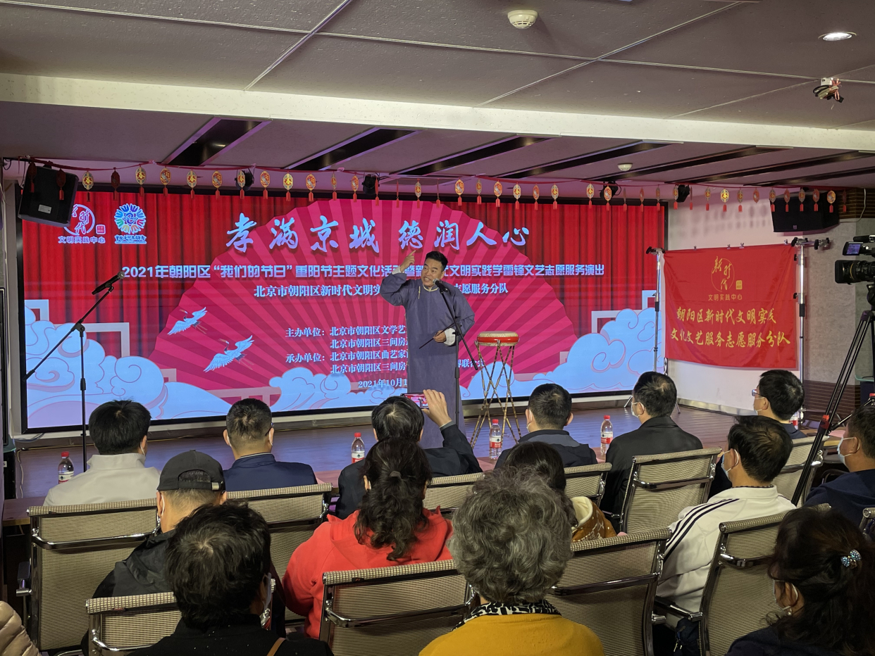 为弘扬中华民族尊老敬老的美德,传承和发扬优秀传统文化,培育和践行社会主义核心价值观,进一步推动文艺志愿服务活动的深入开展,10月14日,在中华民族传统节日“重阳节”到来之际,由北京市朝阳区文学艺术界联合会、北京市朝阳区三间房地区办事处主办,北京市朝阳区曲艺家协会、北京市朝阳区三间房地区文学艺术界联合会共同承办的“孝满京城 德润人心”2021年朝阳区“我们的节日”重阳节主题文化活动暨新时代文明实践学雷锋文艺志愿服务演出在三间房地区文化中心举行,地区群众、文化干部近百人参与观看了此次演出。