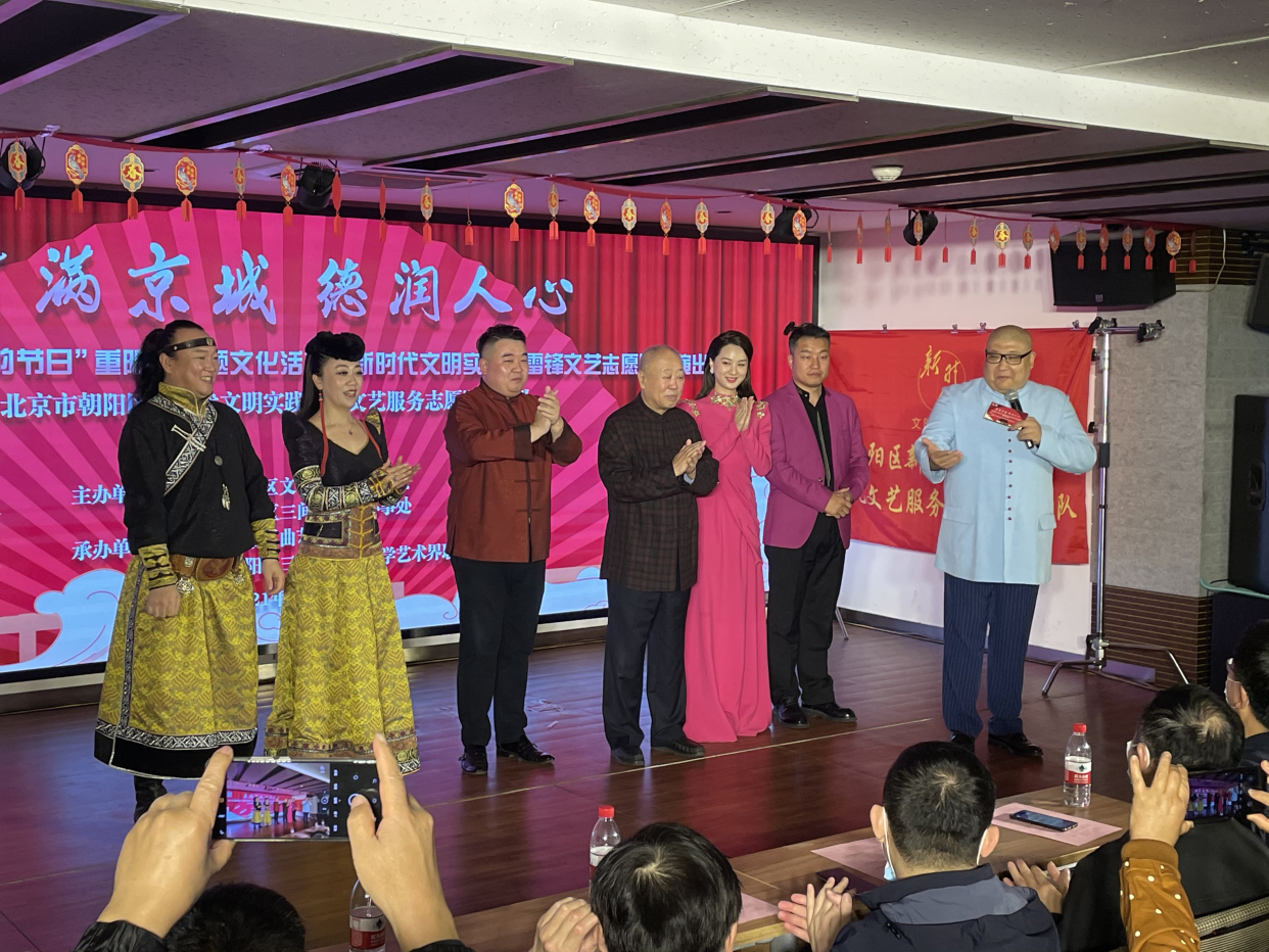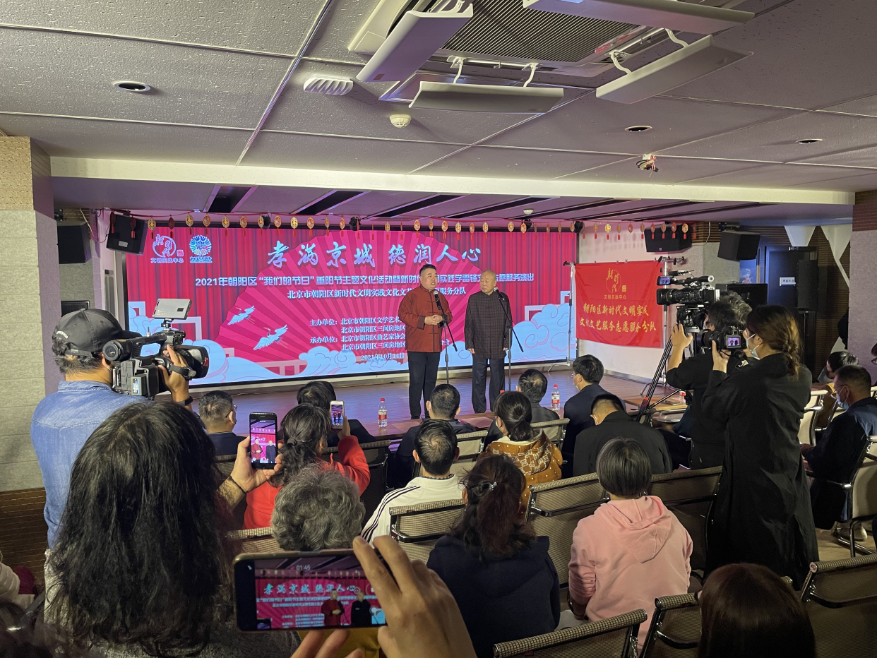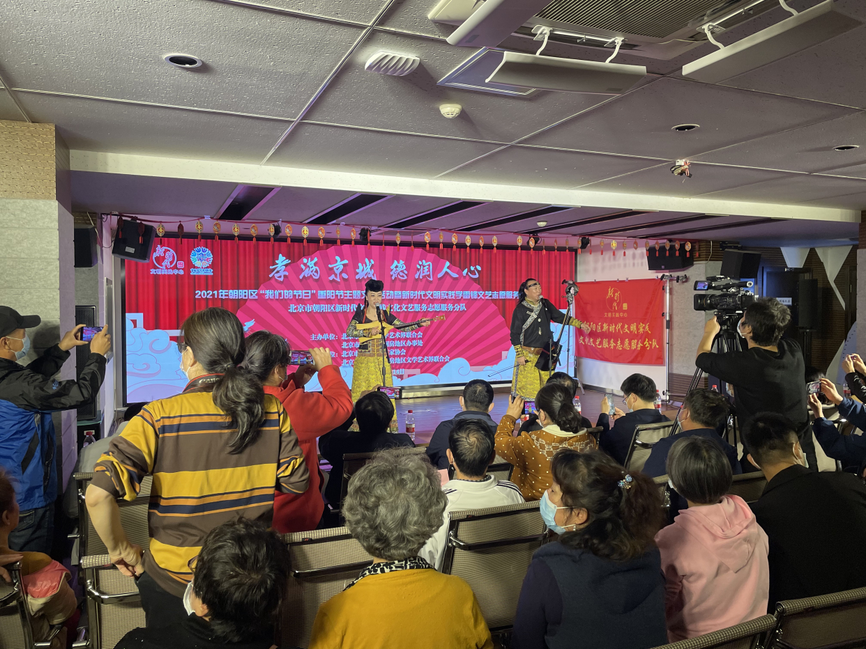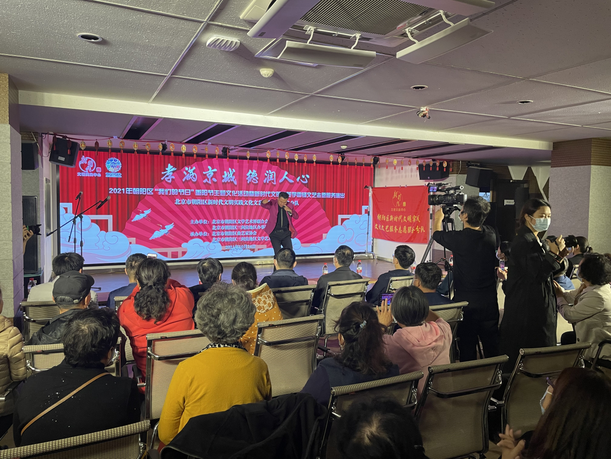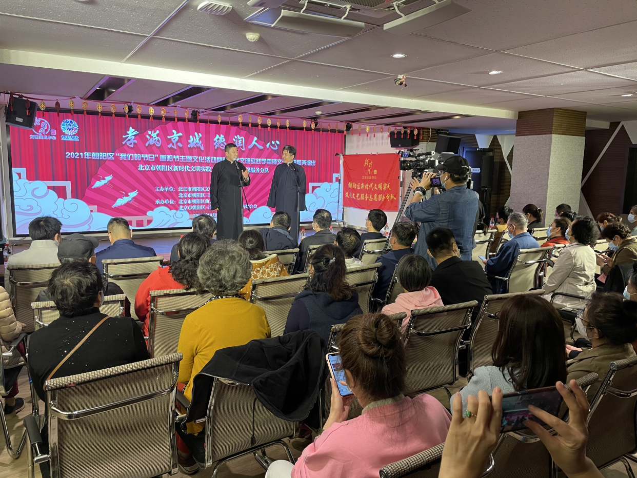 为弘扬中华民族尊老敬老的美德,传承和发扬优秀传统文化,培育和践行社会主义核心价值观,进一步推动文艺志愿服务活动的深入开展,10月14日,在中华民族传统节日“重阳节”到来之际,由北京市朝阳区文学艺术界联合会、北京市朝阳区三间房地区办事处主办,北京市朝阳区曲艺家协会、北京市朝阳区三间房地区文学艺术界联合会共同承办的“孝满京城 德润人心”2021年朝阳区“我们的节日”重阳节主题文化活动暨新时代文明实践学雷锋文艺志愿服务演出在三间房地区文化中心举行,地区群众、文化干部近百人参与观看了此次演出。