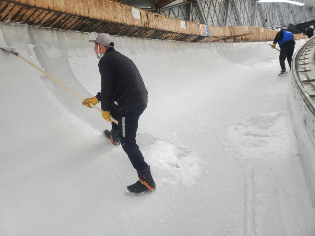 在“相约北京”雪车和钢架雪车国际训练周期间,每次滑行过后的间隙,制冰师团队便开始对赛道进行制冰、修冰、补冰、养护,在聚光灯照不到的地方,他们24小时坚守着,把赛道平整度和光滑度手工打磨至最佳状态,供来自世界的运动员安全使用。