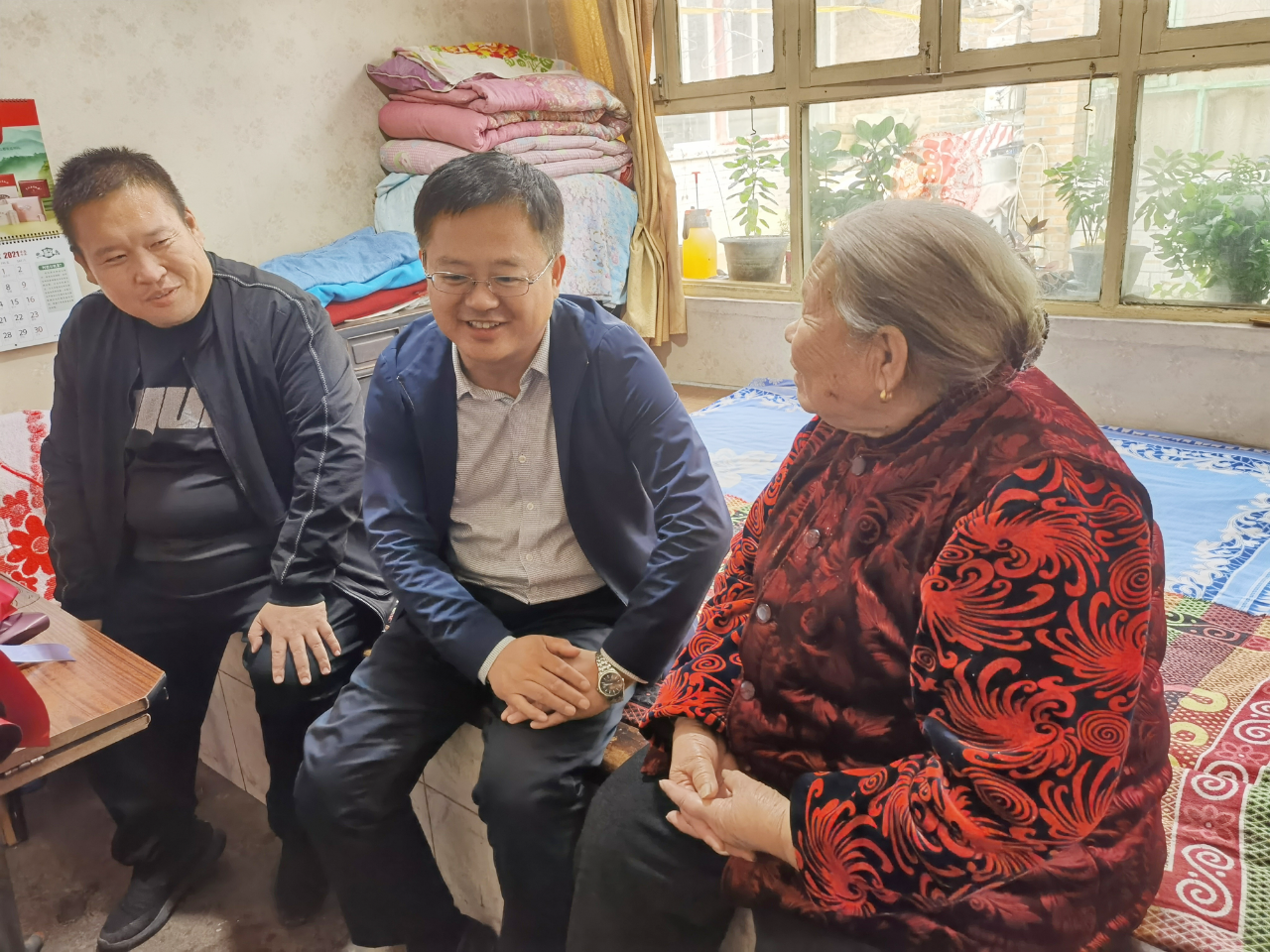 2021年10月14日重阳节,宋庄镇党委委员、副镇长张志翔带着民政社会事务管理科、沐泽社工的工作人员再次来到了93岁于凤芝奶奶家。大家像许久没见的亲人一样,拉着手坐在炕上,听于奶奶分享了近一年来的快乐时光。