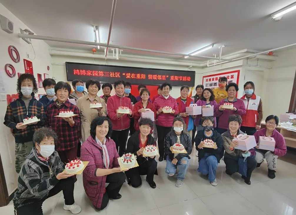 在一年一度的重阳节来临之际,为弘扬中华民族尊老爱老的传统美德,让辖区老年人充分感受社区大家庭的温暖,朝阳区小红门鸿博家园第三社区举办“爱在重阳 情暖邻里”重阳节活动,组织辖区近30位老人,学习蛋糕制作方法。