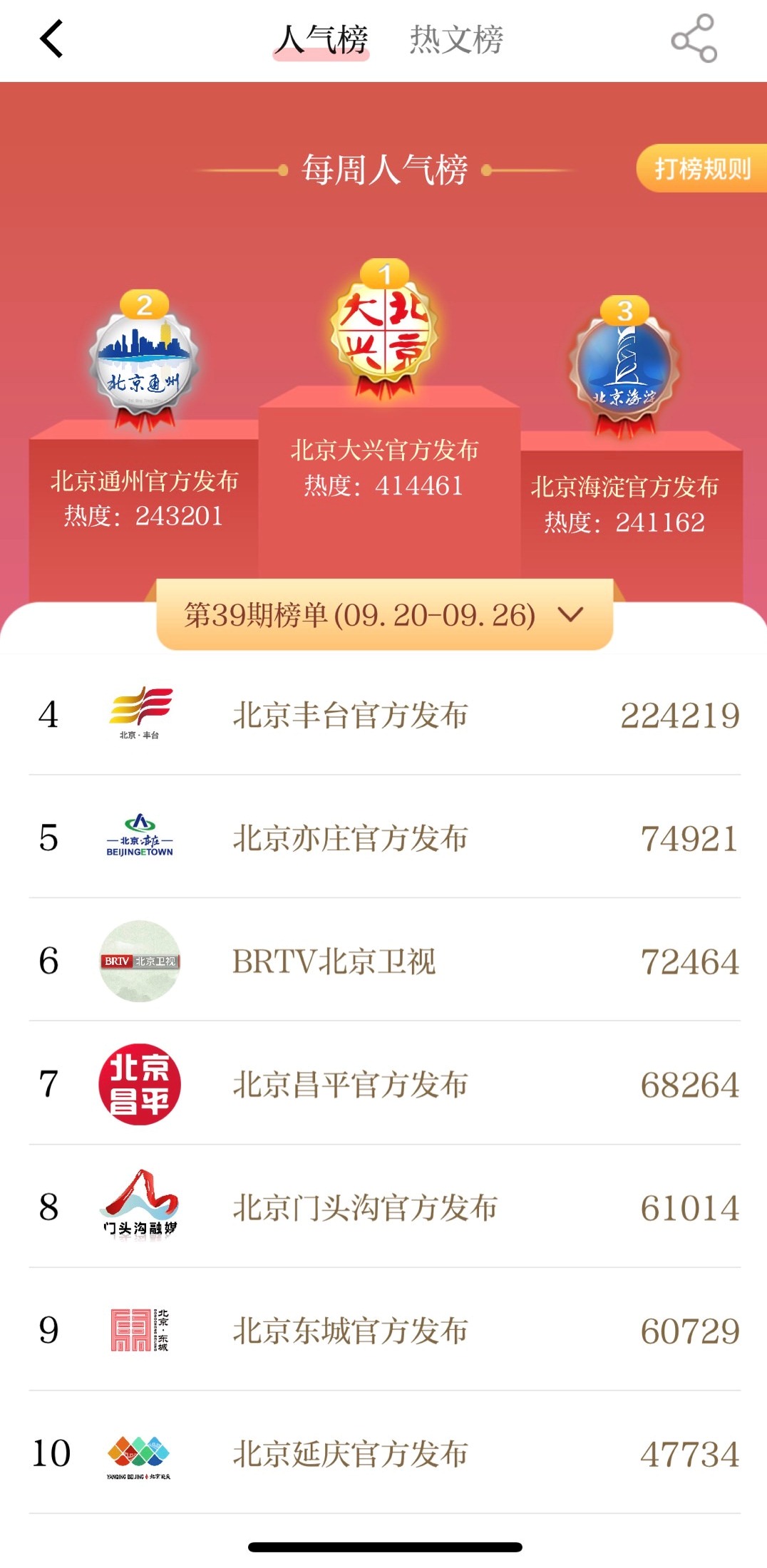 2021年三季度,北京日报社与各入驻单位通力合作,持续拓展新闻触角,不断提升品牌影响力,在本期榜单中,大兴位列“16+1区”影响力前三,与丰台、海淀一同上榜。