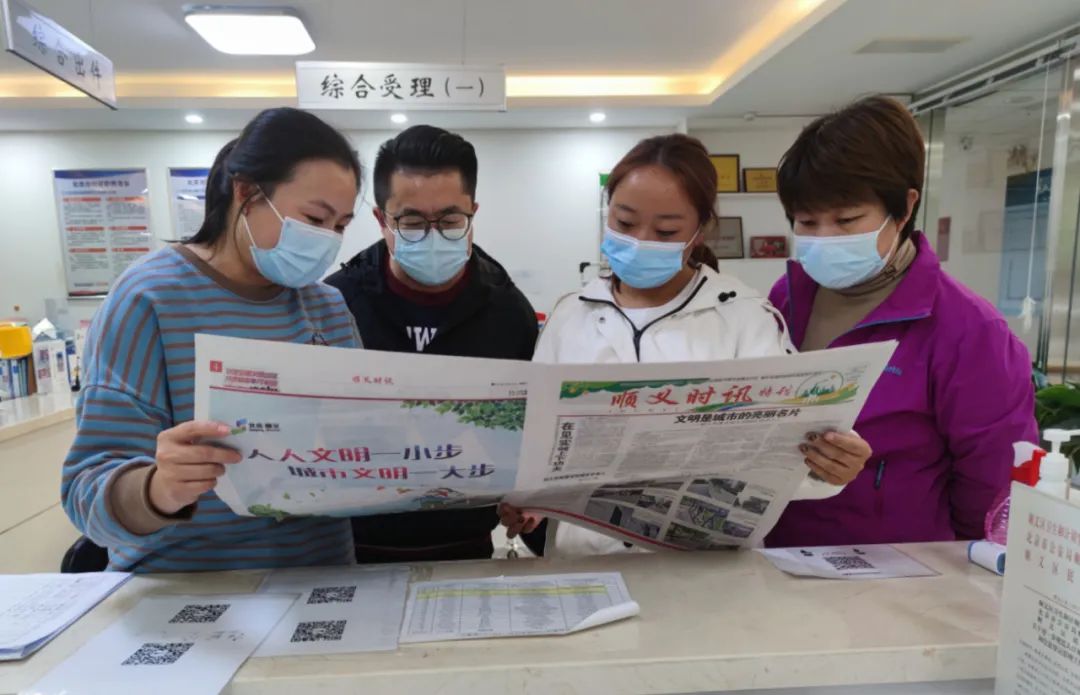 胜利街道社区工作人员在闲暇之余阅读《顺义时讯》创城特刊,学习借鉴其他社区的创城经验。