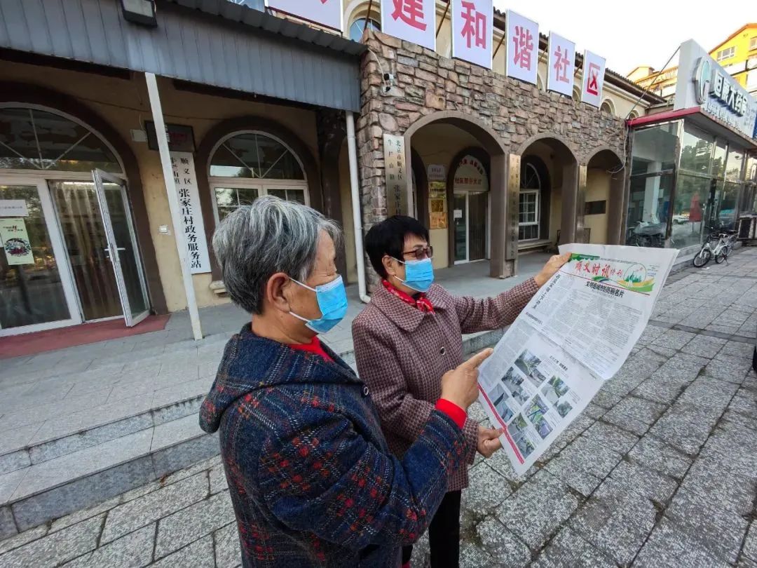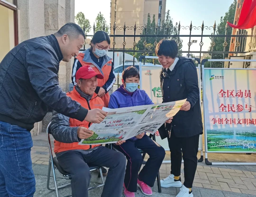 牛栏山镇张庄家园居民阅读《顺义时讯》创城特刊,了解创城知识和信息。