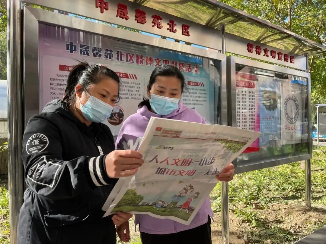马坡镇中晟馨苑北社区居民阅读《顺义时讯》创城特刊,关注创城给社区带来的新变化。