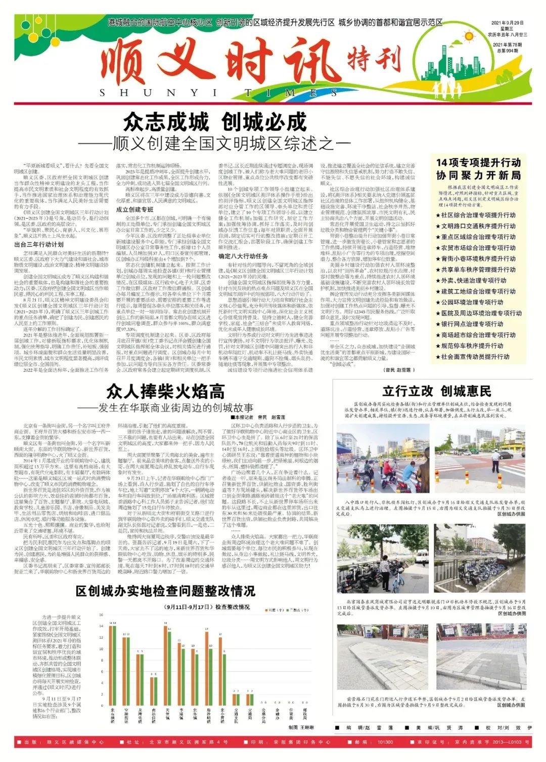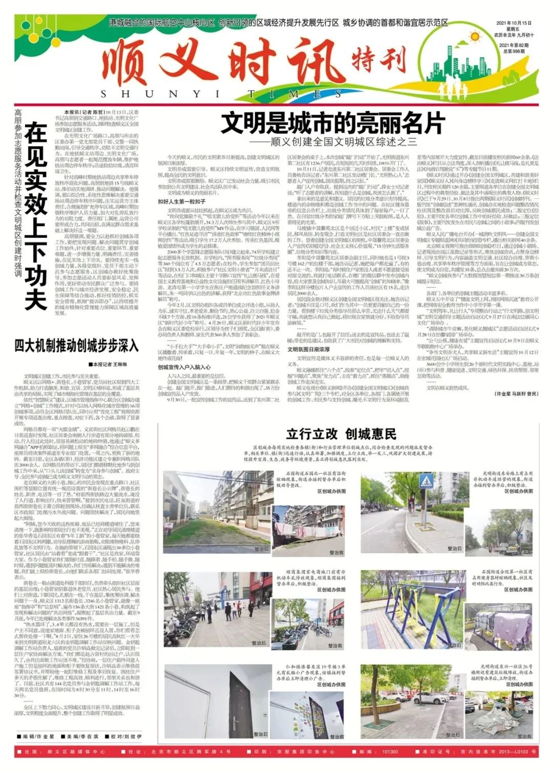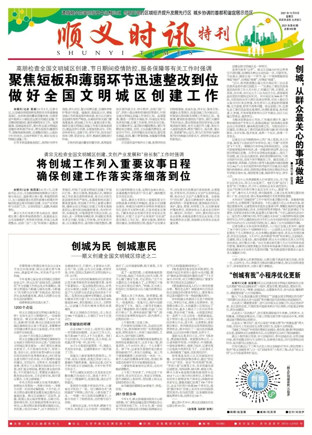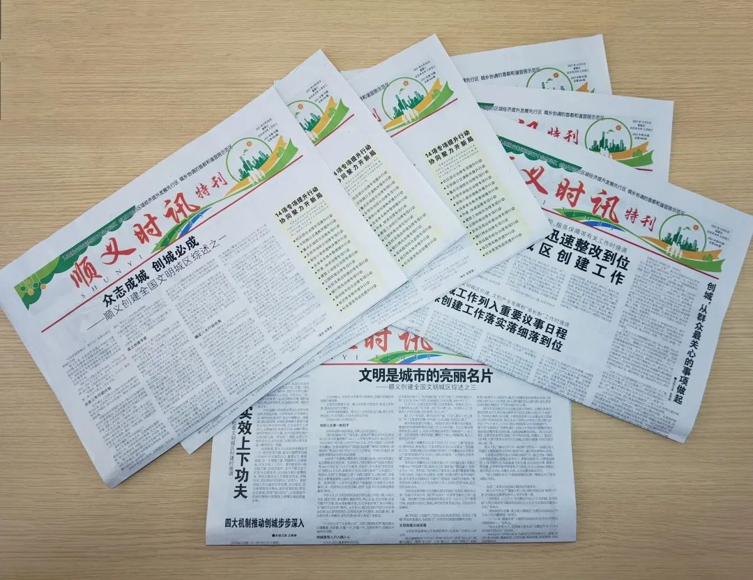 《顺义时讯》于9月29日、10月8日、10月15日推出三期《顺义时讯》创城特刊。一版主要刊发顺义区创城工作亮点、“创城综述”思辨性通讯、区创城办实地检查问题整改情况柱状图及整改前后对比图,反映创城惠民成效;二版《经验》主要刊发各单位创城工作中的好经验、好做法;三版《故事》主要刊发市民与创城之间的小故事;四版刊发创城公益广告。