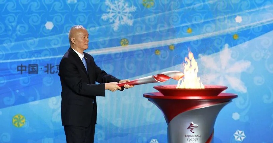 北京市委书记、北京冬奥组委主席蔡奇点燃仪式火种台(新华社 张晨霖 摄)