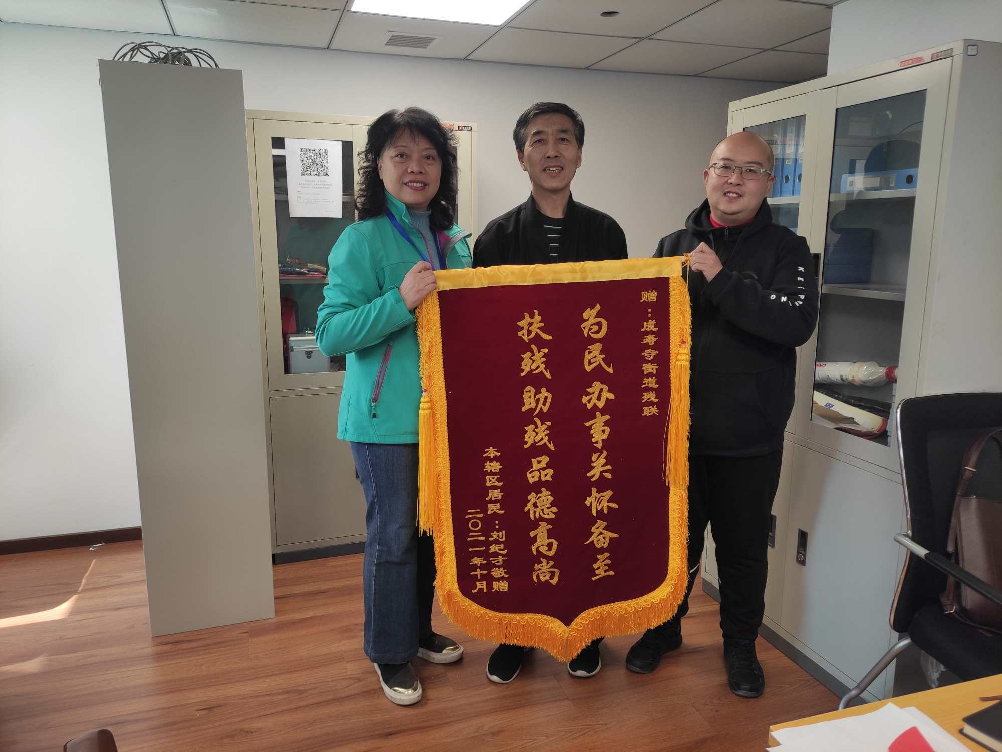 10月18日上午,成寿寺街道四方景园社区残疾人刘纪才给民生办送来一幅锦旗,感谢街道民生办和四方景园社区,为他解决了困扰一年的残疾人保险补贴问题。他动情地说:“我是一个下岗没有工作的残疾人,新成立的成寿寺街道办事处让我找到了家,找到了组织让我实实在在享受了党和政府的惠民政策,享受了党和政府对残疾人的关怀,感谢成寿寺街道的同志们。”