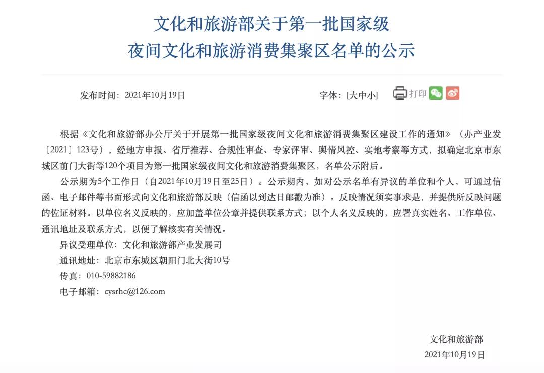 日期,文化和旅游部发布了第一批国家级夜间文化和旅游消费集聚区名单。经地方申报、省厅推荐、合规性审查、专家评审、舆情风控、实地考察等方式,拟确定北京市东城区前门大街等120个项目为第一批国家级夜间文化和旅游消费集聚区。