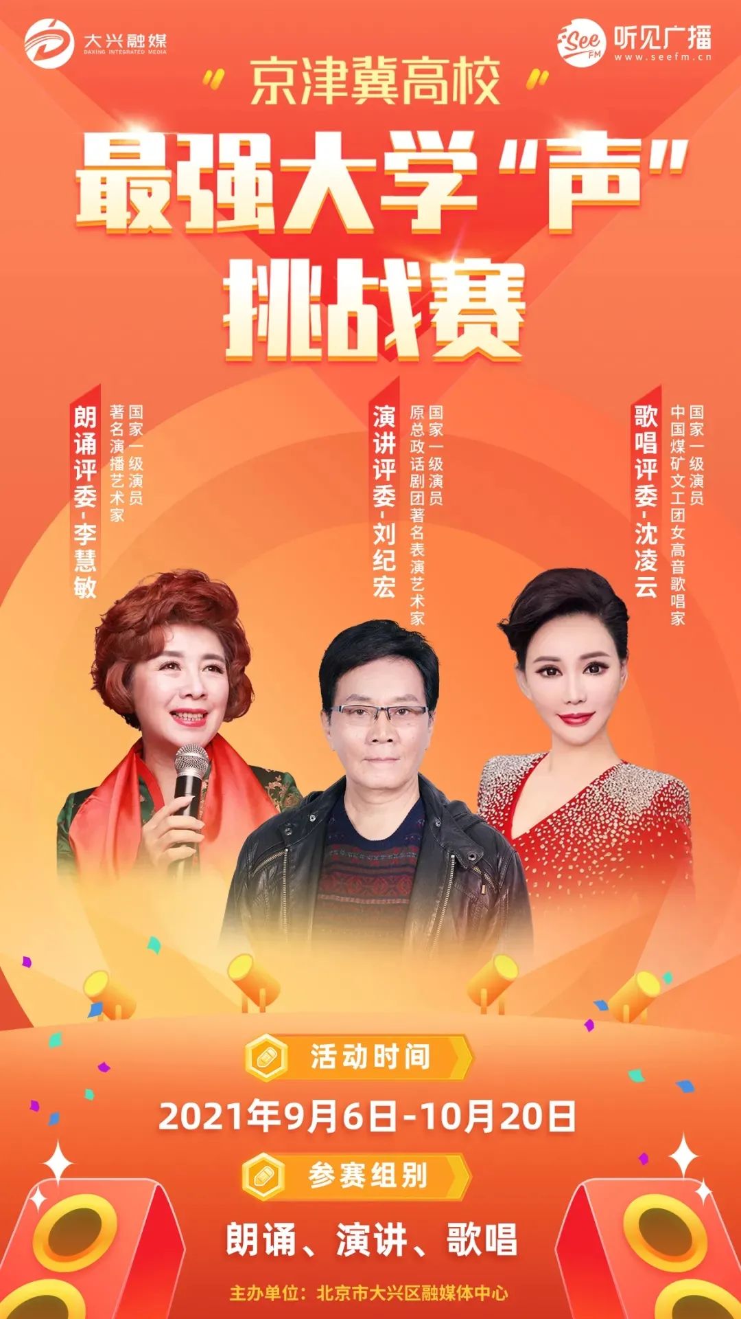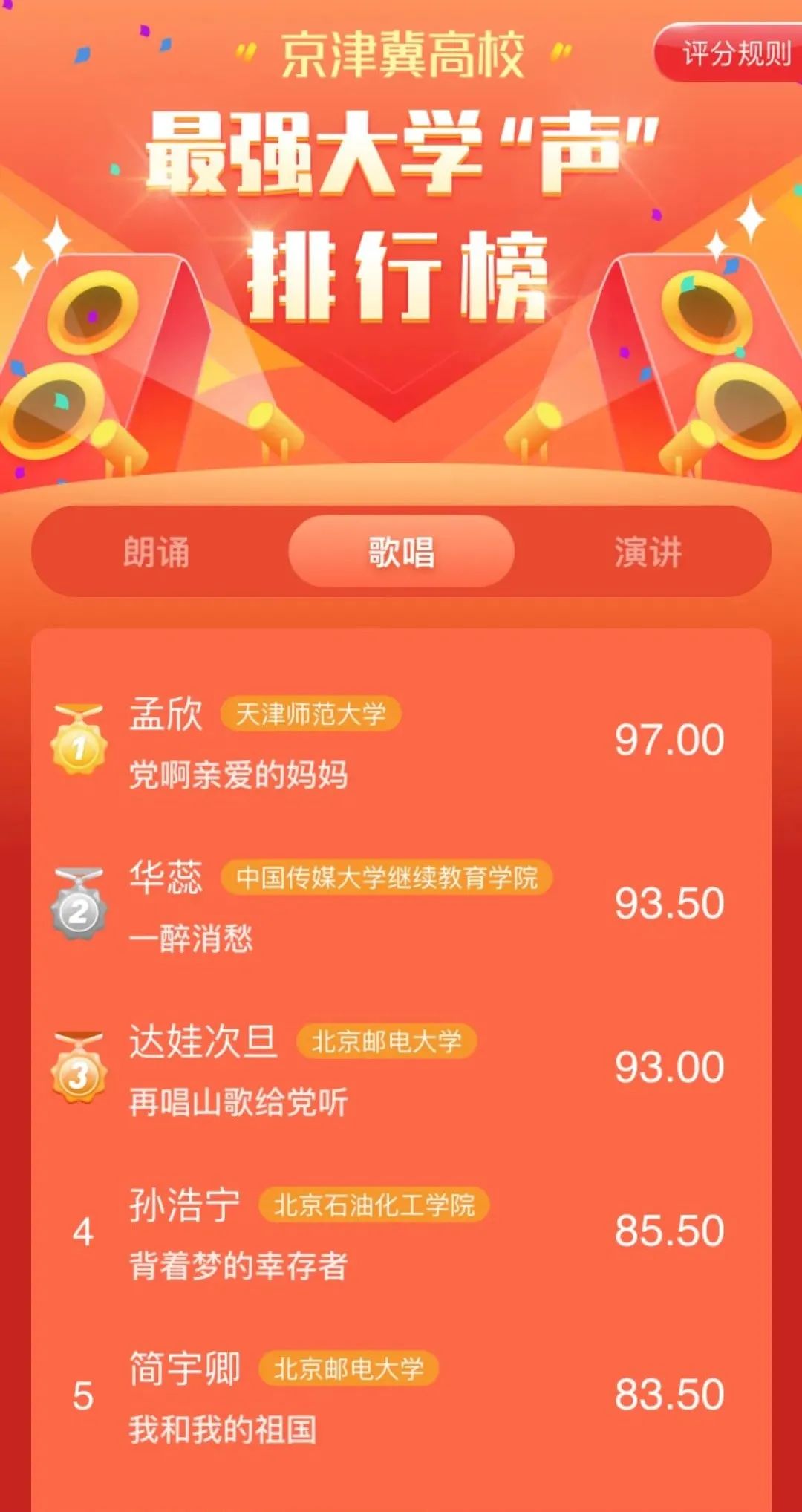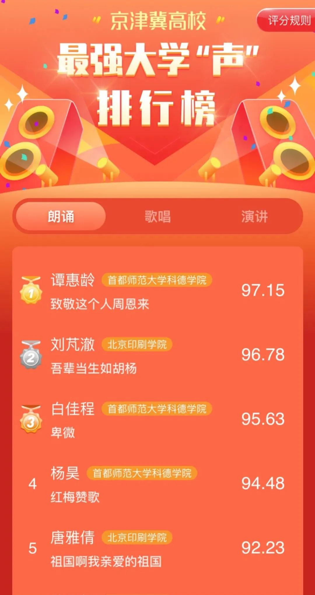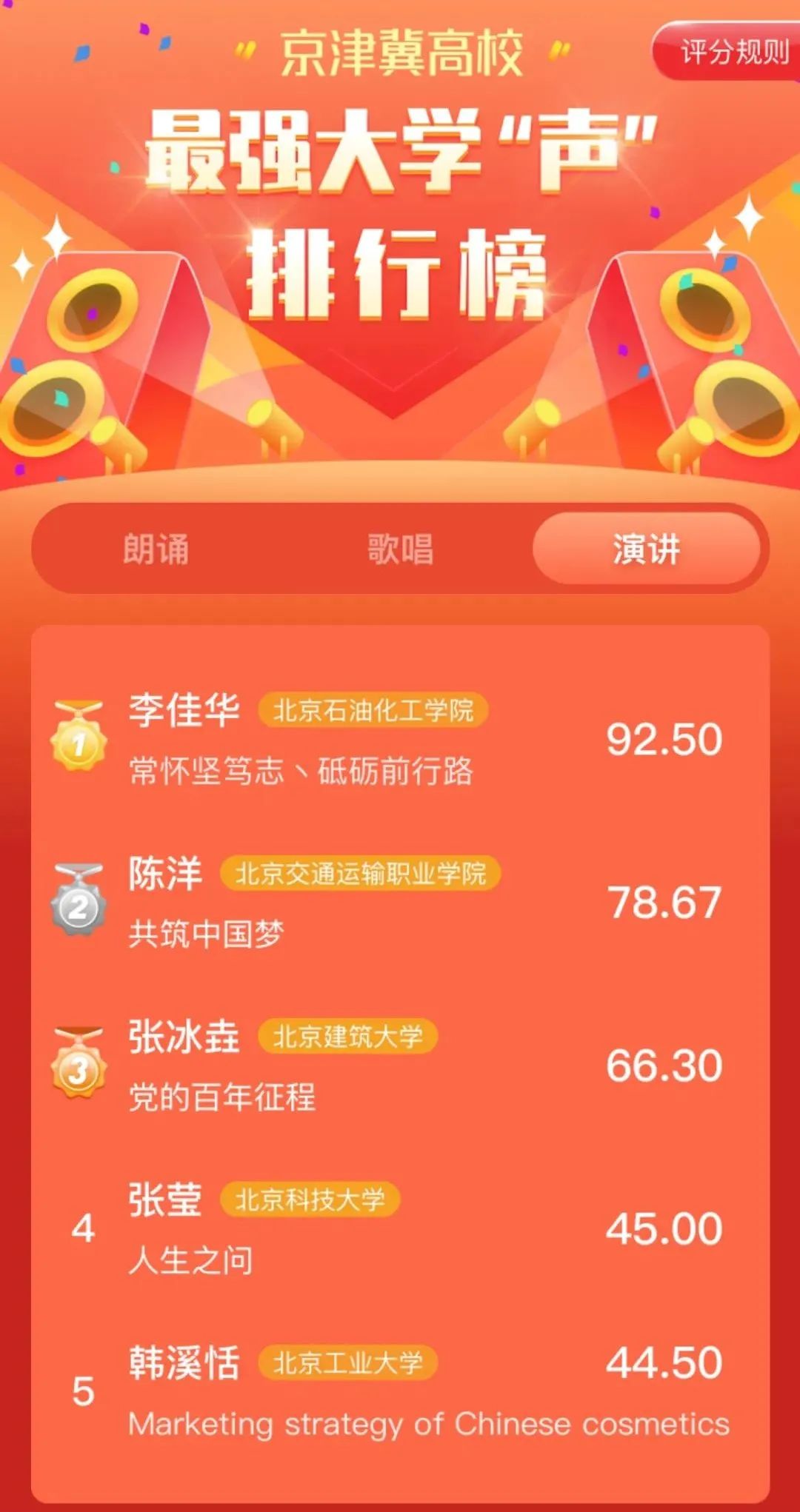 本次活动面向京津冀高校的全日制在校大学生展开,参赛、评审全程线上进行,比赛共设置三个项目,分为朗诵组、演讲组和歌唱组,点击下方图片查看排行榜。