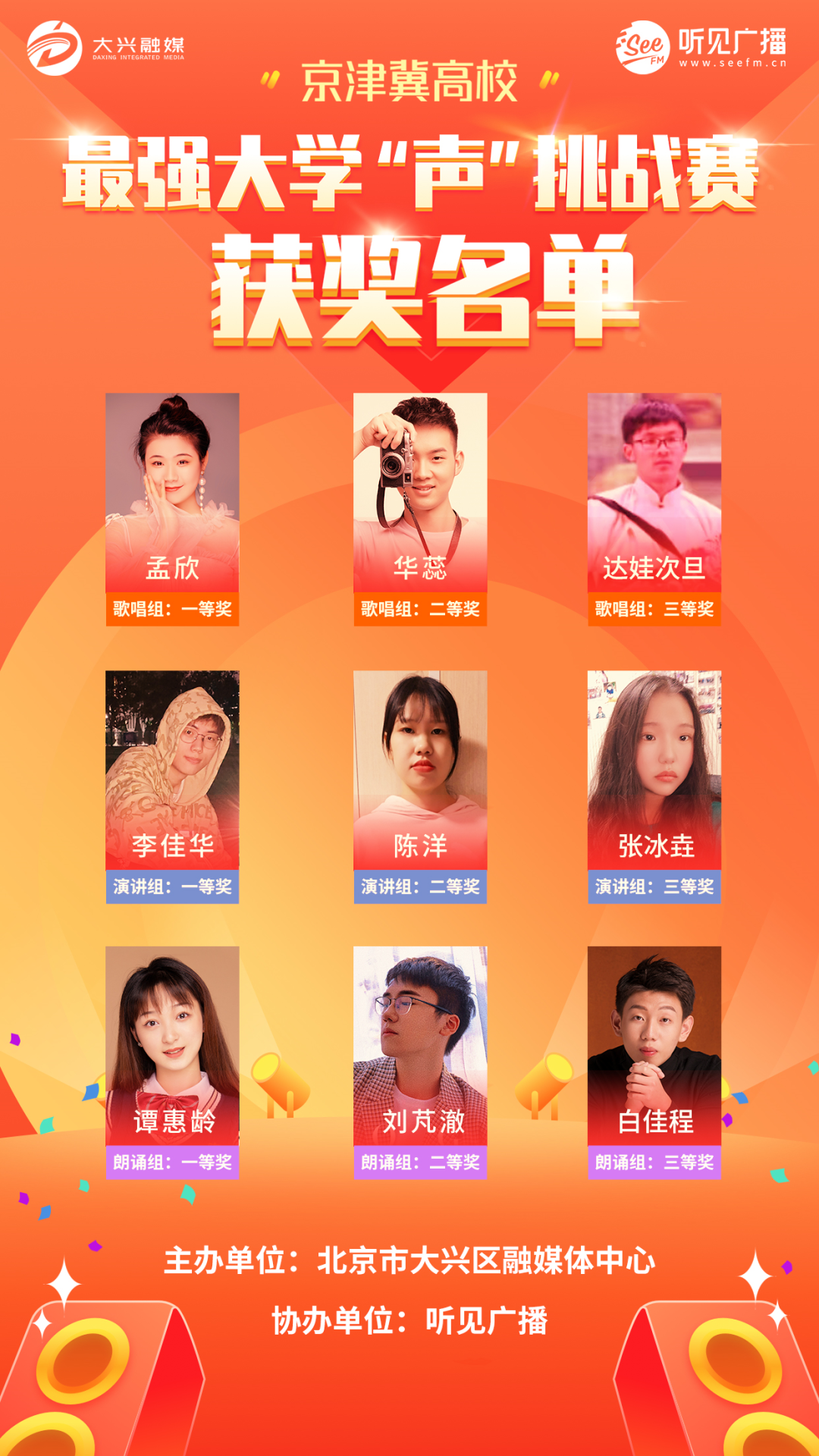 让我们恭喜这9位同学,同时获奖作品将在“北京大兴”客户端、“听见广播”客户端等多家媒体平台展示播放,感兴趣的小伙伴,快去客户端观看吧!