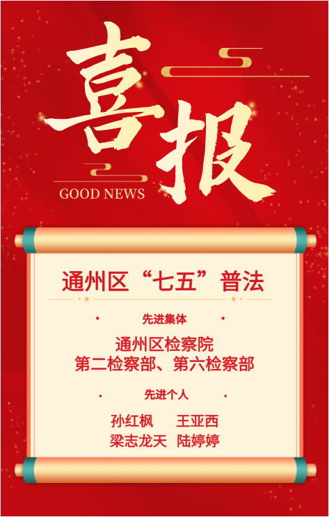 10月20日,通州区“八五”普法启动仪式暨新媒体普法矩阵发布活动在京杭大运河书院举行,活动现场宣布了中共北京市通州区委全面依法治区委员会守法普法协调小组《关于通报表扬通州区“七五”普法先进集体和先进个人的决定》,其中通州区检察院第二检察部、第六检察部获“通州区‘七五’普法先进集体”、干警孙红枫、王亚西、梁志龙天、陆婷婷获“通州区‘七五’普法先进个人”称号。