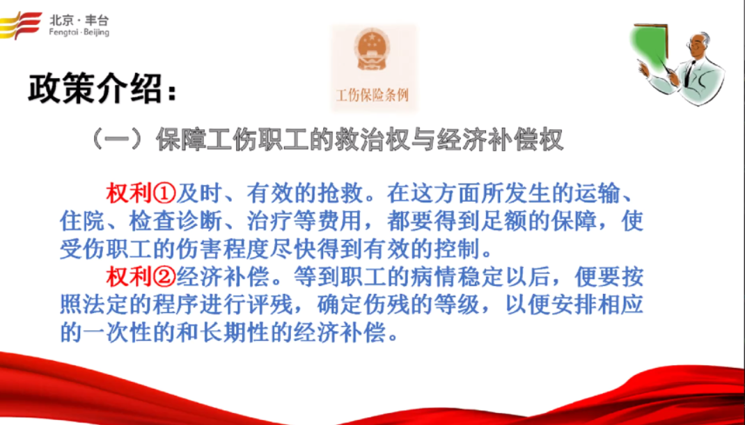 近日,为进一步做好新时期工伤保险普法宣传工作,根据国家和北京市相关要求,丰台人力社保局利用企业微信直播的形式开展工伤保险政策培训活动,向辖区内制造、交通运输、建筑施工等企业和机关事业单位负责人及职工宣传《工伤保险条例》、《关于做好北京市建筑业工伤保险工作的通知》以及申请工伤认定、劳动能力鉴定、工伤保险待遇、依法参保缴费等内容,并解答工伤保险相关问题。