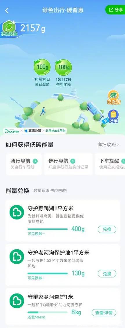 10月19日,北京市交通委员、阿里巴巴公益和高德地图联合上线“北京MaaS平台绿色出行碳普惠公益项目”,市民使用高德地图,可获得公交、地铁、骑行、步行等绿色出行方式产生的相应碳减排能量,个人账户中的碳能量不仅可以兑换多样化礼品,还可以支持生态环境保护和珍稀动物保护等公益项目,如守护北京野鸭湖自然保护区、守护家乡河流、守护四川老河沟保护生态环境和珍稀动物等。