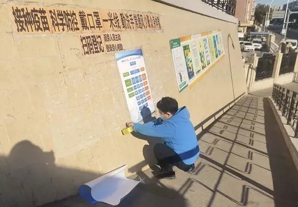 社区安排工作人员在辖区内主要路口或人员集中居住地张贴疫情防控宣传标语、海报、宣传单,进一步强化防疫宣传推广。