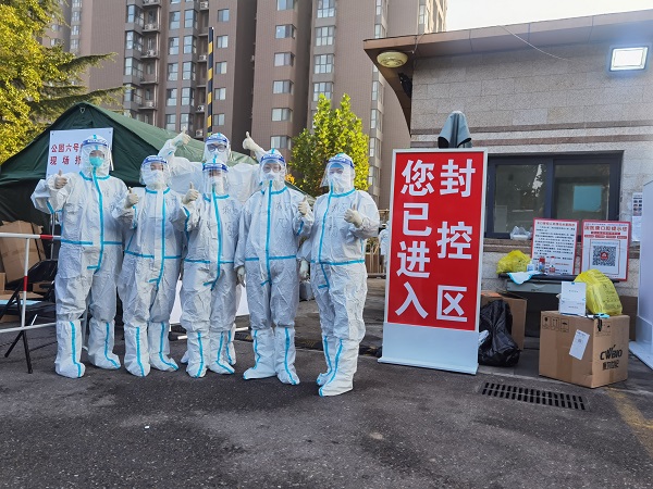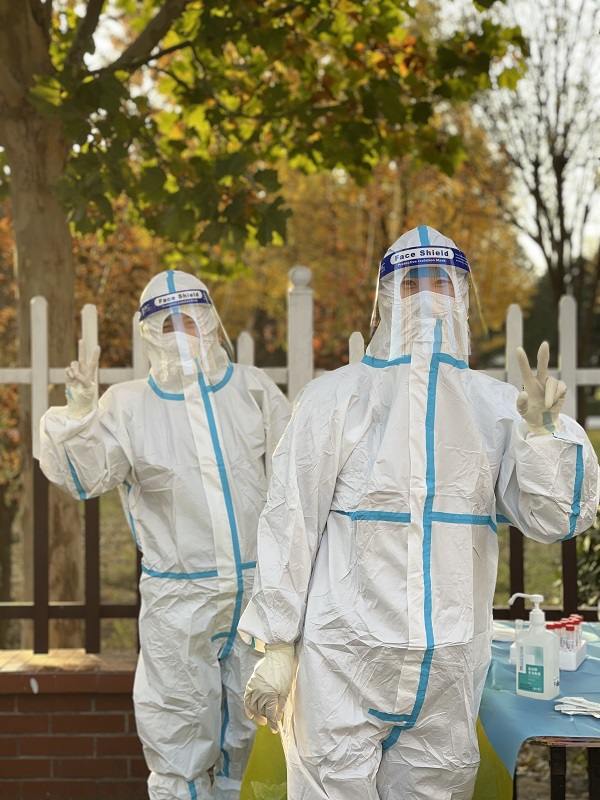 入户采样结束,一组人员重新更换防护服,为当天隔离小区工作人员、公安、保安等人员采集核酸。